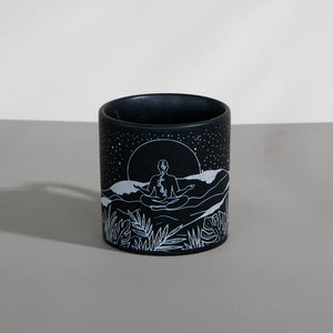 This Diwali Gift Hamper blends tranquility and elegance, perfect for a peaceful celebration. It features a matte black coffee mug with a serene print of a person in deep meditation, surrounded by nature, ocean, mountains, stars, and the moon—symbolizing harmony with the universe. Paired with a matching ceramic essence jar candle in soothing lavender fragrance, and a message bottle filled with Diwali wishes, this hamper is a thoughtful gift to inspire calm and mindfulness this festive season.