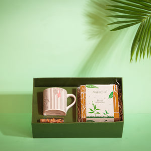 This Diwali Gift Hamper brings together elegance and thoughtfulness in a perfect festive package. It includes a stylish matte white coffee mug featuring a striking zebra print emerging from grey vertical lines, a Basil Grow Kit for adding greenery to your space, and a charming message bottle with heartfelt Diwali wishes. A meaningful gift that combines beauty, nature, and festive cheer!