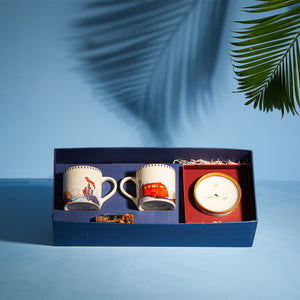 This Diwali Gift Hamper is perfect for travel enthusiasts with a love for adventure and the festive spirit. It includes a pair of matte white coffee mugs, featuring a playful illustration of a caravan van on a scenic road trip, evoking wanderlust and the joy of exploration. Complementing the mugs is a handpainted terracotta essence diya in a soothing lavender fragrance, along with a message bottle filled with heartfelt Diwali wishes. This hamper is a unique way to celebrate the festival of lights while embracing the spirit of travel and adventure.