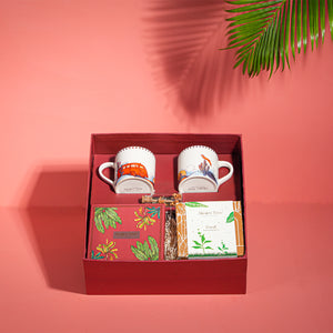 Delight in our Diwali Gift Hamper, designed for travel enthusiasts! This charming set features two matte white coffee mugs showcasing a caravan travel theme, perfect for sipping your favorite beverages. Accompanying them is a handpainted terracotta essence diya infused with soothing lavender fragrance, a basil grow kit to inspire green thumbs, and a message bottle filled with heartfelt Diwali wishes. This thoughtfully curated hamper combines adventure, aroma, and well-wishes, making it a perfect gift to celebrate the festive season!