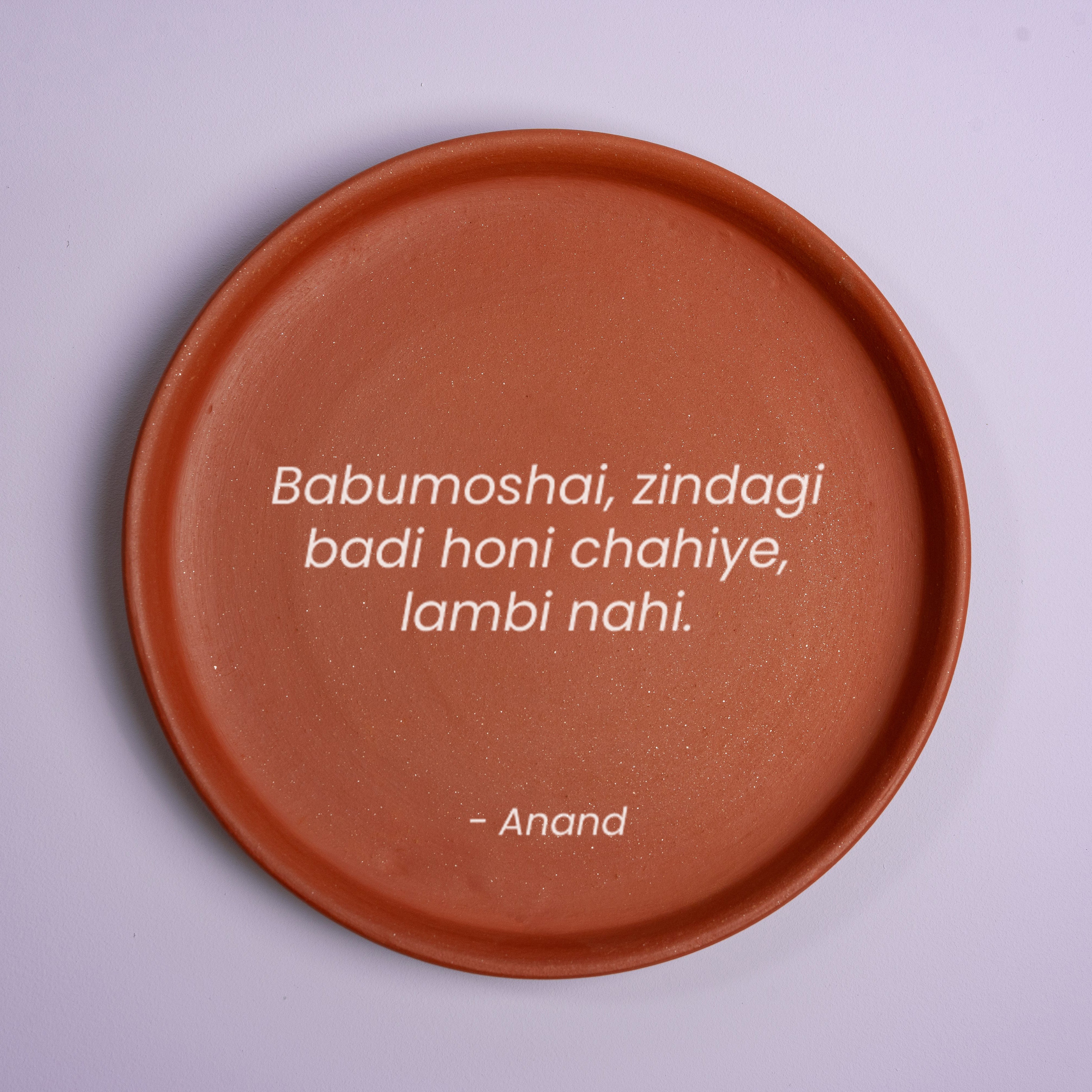 Celebrate the essence of life with this exquisite terracotta wall plate featuring the iconic quote from the legendary Rajesh Khanna in the film Anand. The phrase translates to "Life should be big, not long," capturing the timeless wisdom of living a meaningful and fulfilling life rather than merely existing. Handcrafted with care, this plate adds a touch of classic cinema and profound philosophy to your decor. Perfect for inspiring conversations and reflections in your home.