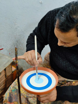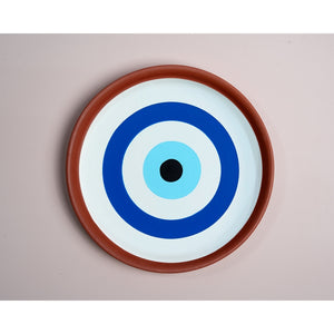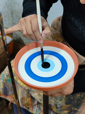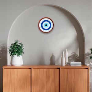 This handcrafted evil eye terracotta wall plate features a bold concentric design in calming blue and white tones, symbolising protection, positivity, and warding off negative energy. Framed with a natural terracotta rim, it blends traditional symbolism with a modern aesthetic—perfect for entrances, living spaces, or gifting.