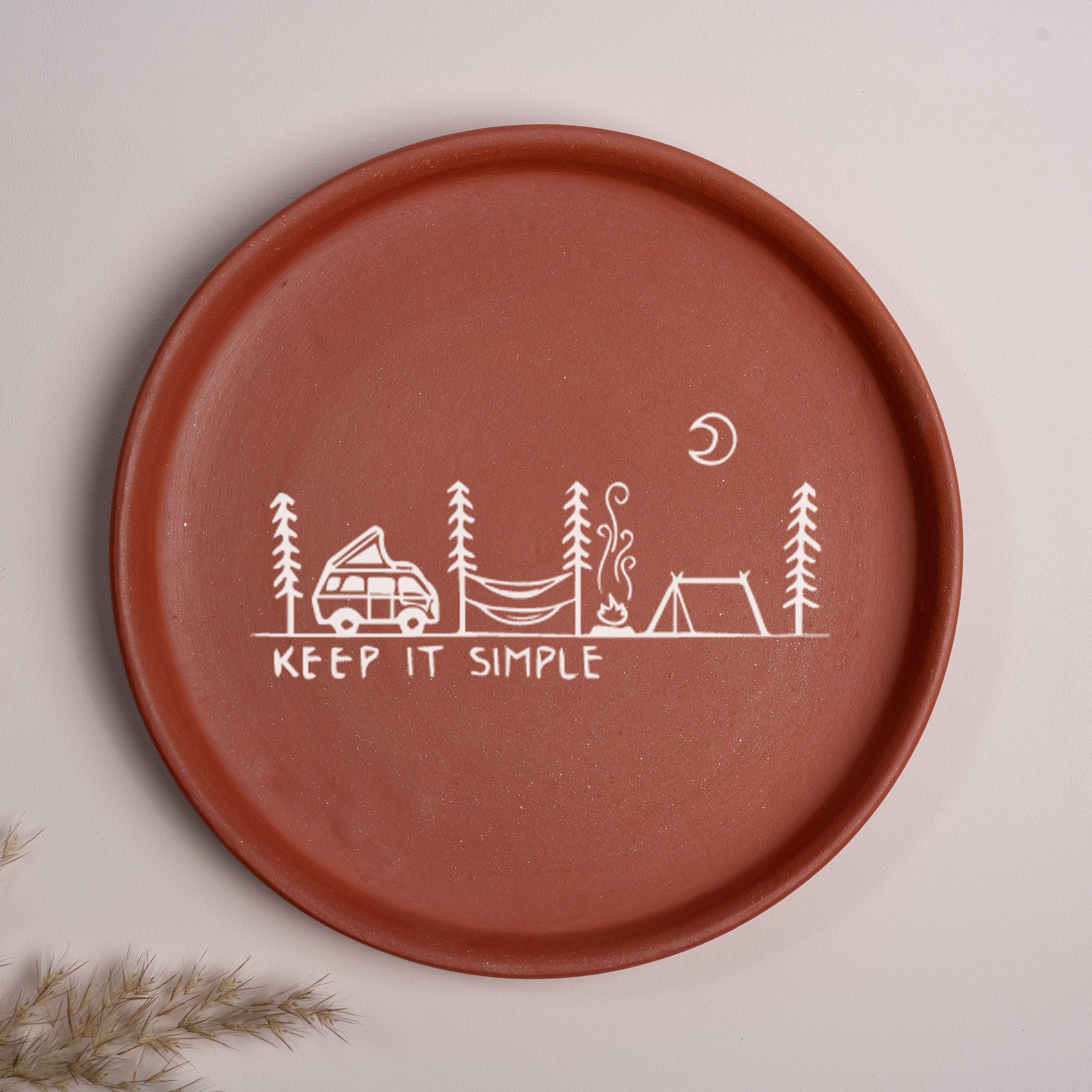 Bring the serenity of the great outdoors into your home with our handcrafted terracotta wall plate. Featuring a picturesque scene of a parked caravan van nestled in a lush forest, this piece captures the essence of a peaceful camping getaway. Perfect for nature lovers and adventure seekers, this unique wall decor adds a touch of rustic charm and wanderlust to any space. Let the spirit of the wilderness inspire your everyday moments with this beautifully detailed art piece.