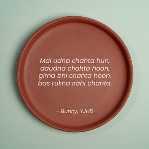 Elevate your space with this charming terracotta wall plate featuring the iconic quote "Mai Udna Chahta Hun" from Yeh Jawaani Hai Deewani. Handcrafted with love, this piece captures the essence of ambition and freedom. Perfect for adding a touch of inspiration and a hint of Bollywood magic to your decor. Celebrate your dreams and passions with a timeless reminder that the sky's the limit!