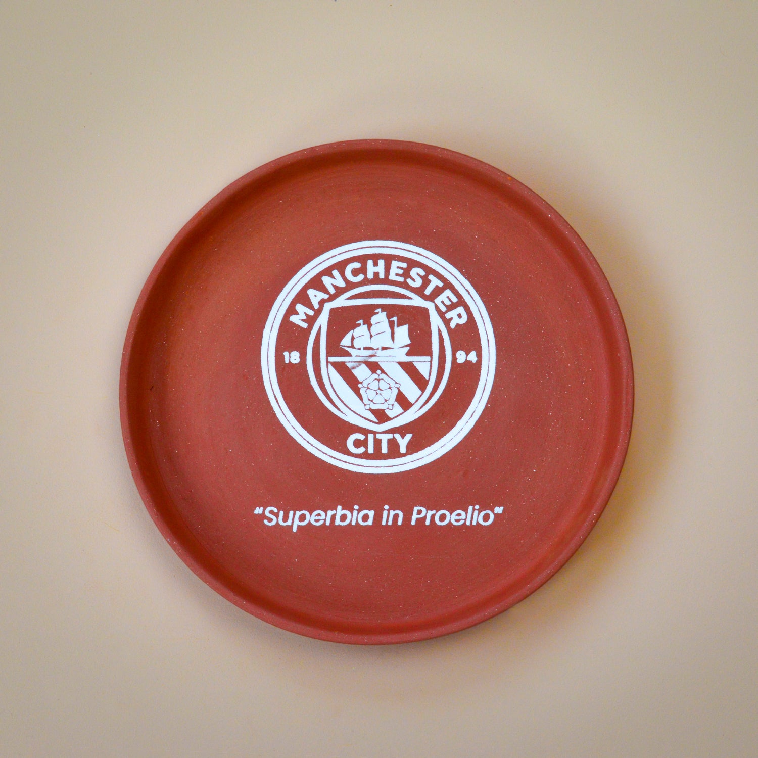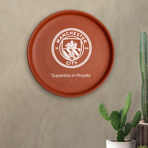 This hand-painted terracotta wall plate proudly showcases the Manchester City football club logo in crisp white, strikingly contrasting the warm terracotta base. A perfect blend of sports passion and artistry, it’s an ideal decor piece for devoted City fans, adding a unique and rustic charm to any space.