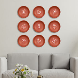 Elevate your living space with this beautifully curated set of 9 terracotta wall plates, each featuring a delicate white line illustration of botanical elements. Handcrafted in warm earthy tones, these plates blend natural charm with minimalist elegance. The matte terracotta finish adds rustic depth, while the hand-drawn plant motifs bring a sense of calm and connection to nature. Perfect for boho, earthy, or contemporary interiors, this arrangement makes a stunning statement above sofas, beds, or hallway consoles. Suitable for both outdoor and indoor spaces.