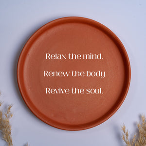 Let serenity take center stage with this handcrafted 8" terracotta wall plate. Imprinted with the calming words “Relax the mind. Renew the body. Revive the soul.”, it serves as a gentle reminder to prioritize self-care and inner balance. A perfect blend of earthy elegance and mindful living, this piece adds warmth and wellness to any corner of your home.