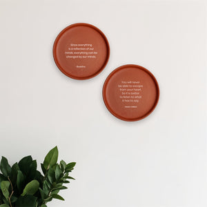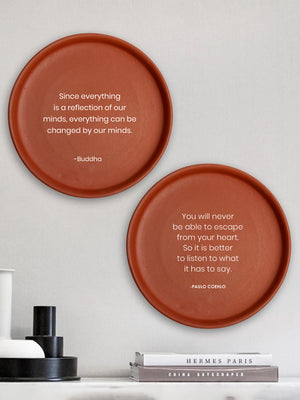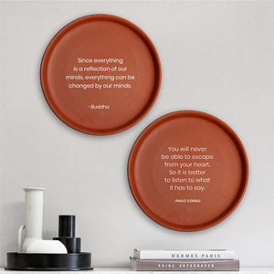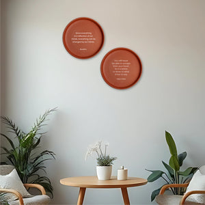 Add a touch of wisdom and elegance to your space with this set of two hand-painted terracotta wall plates, featuring inspiring English quotes by Buddha and Paulo Coelho. The white lettering on natural terracotta creates a striking contrast, blending minimalist aesthetics with profound meaning. Perfect for motivational corners, meditation spaces, or as thoughtful gifts, these plates serve as daily reminders of positivity, mindfulness, and the power of dreams. A beautiful fusion of art and philosophy, they make a timeless addition to any wall.