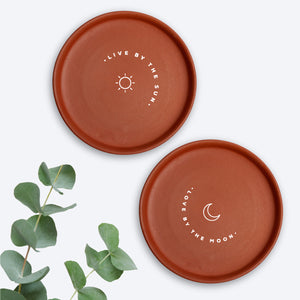 Illuminate your space with this stunning set of two terracotta wall plates, each featuring captivating abstract art. One plate showcases a vibrant depiction of the sun, while the other highlights the serene beauty of the moon. The sun plate is accompanied by the inspiring quote, "Live by the sun," symbolizing warmth and vitality, while the moon plate features the gentle reminder, "Love by the moon," reflecting tranquility and affection. Handcrafted with care, this dynamic duo brings a harmonious balance of light and love to your decor, making it a perfect addition for those who cherish the cosmic dance of day and night.