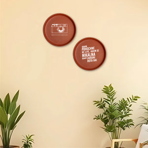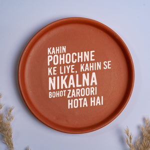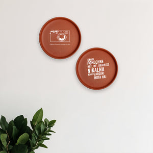Celebrate your love for photography and adventure with this set of two hand-painted terracotta wall plates. The first plate features a beautifully detailed illustration of a camera, paired with the inspiring quote "Capture the world through my lens", perfect for those who see life as a series of unforgettable moments. The second plate showcases the iconic dialogue from Yeh Jawaani Hai Deewani – "Kahin pahunchne ke liye kahin se nikalna bahut zaroori hai", painted in white, emerging gracefully from the warm terracotta background. A perfect décor piece for travelers, storytellers, and dreamers, this set adds a touch of wanderlust and passion to any space, making it an ideal addition to your home or a thoughtful gift for photography enthusiasts.