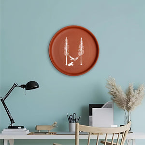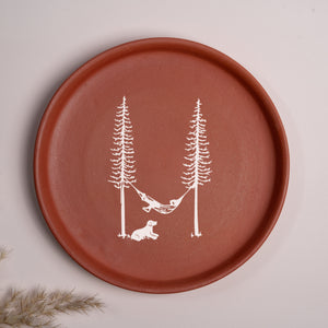 Experience tranquility with our terracotta wall plate featuring a serene scene of a person resting in a hammock, shaded by a majestic tree, while their loyal dog lounges peacefully beneath. This art piece captures the essence of relaxation and the simple joys of nature, bringing a touch of calm and comfort to any space.