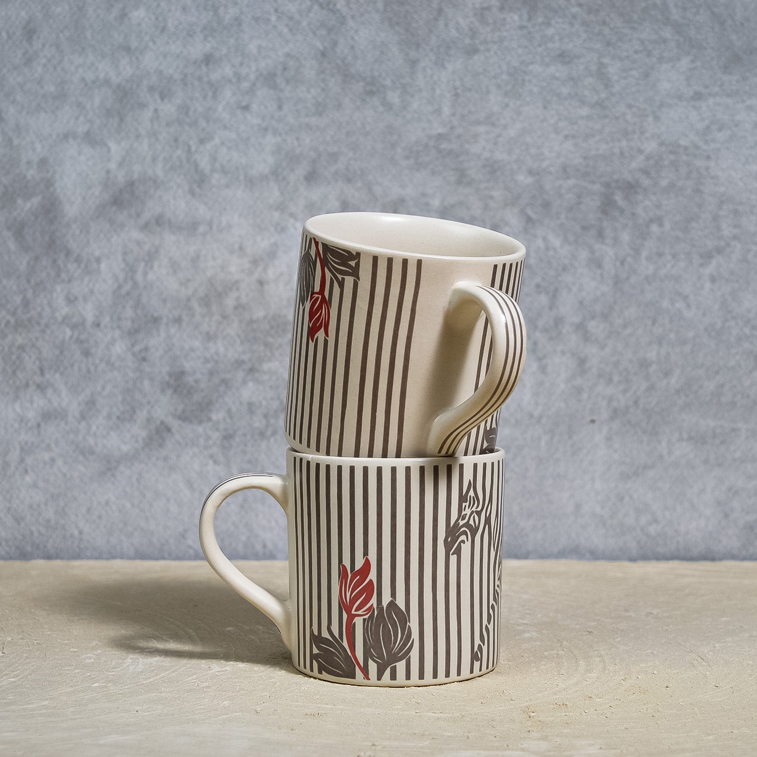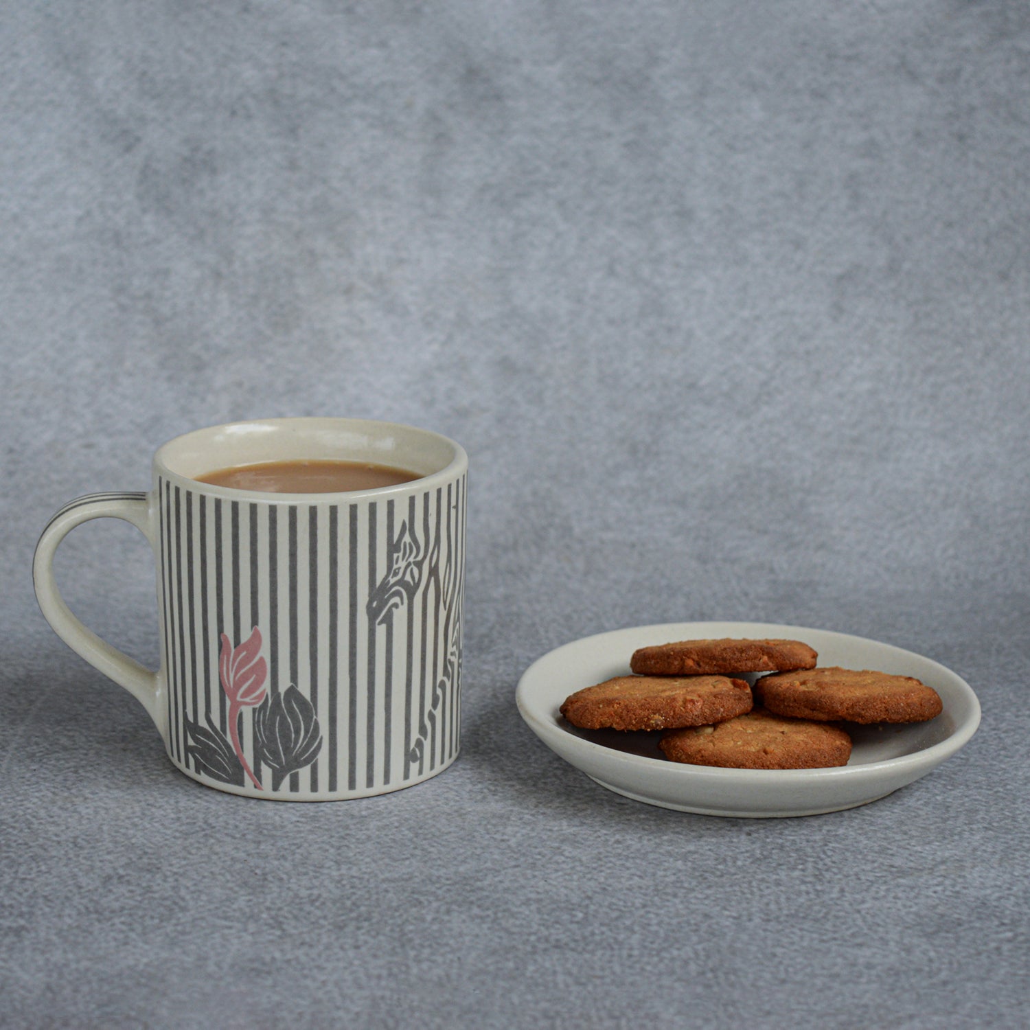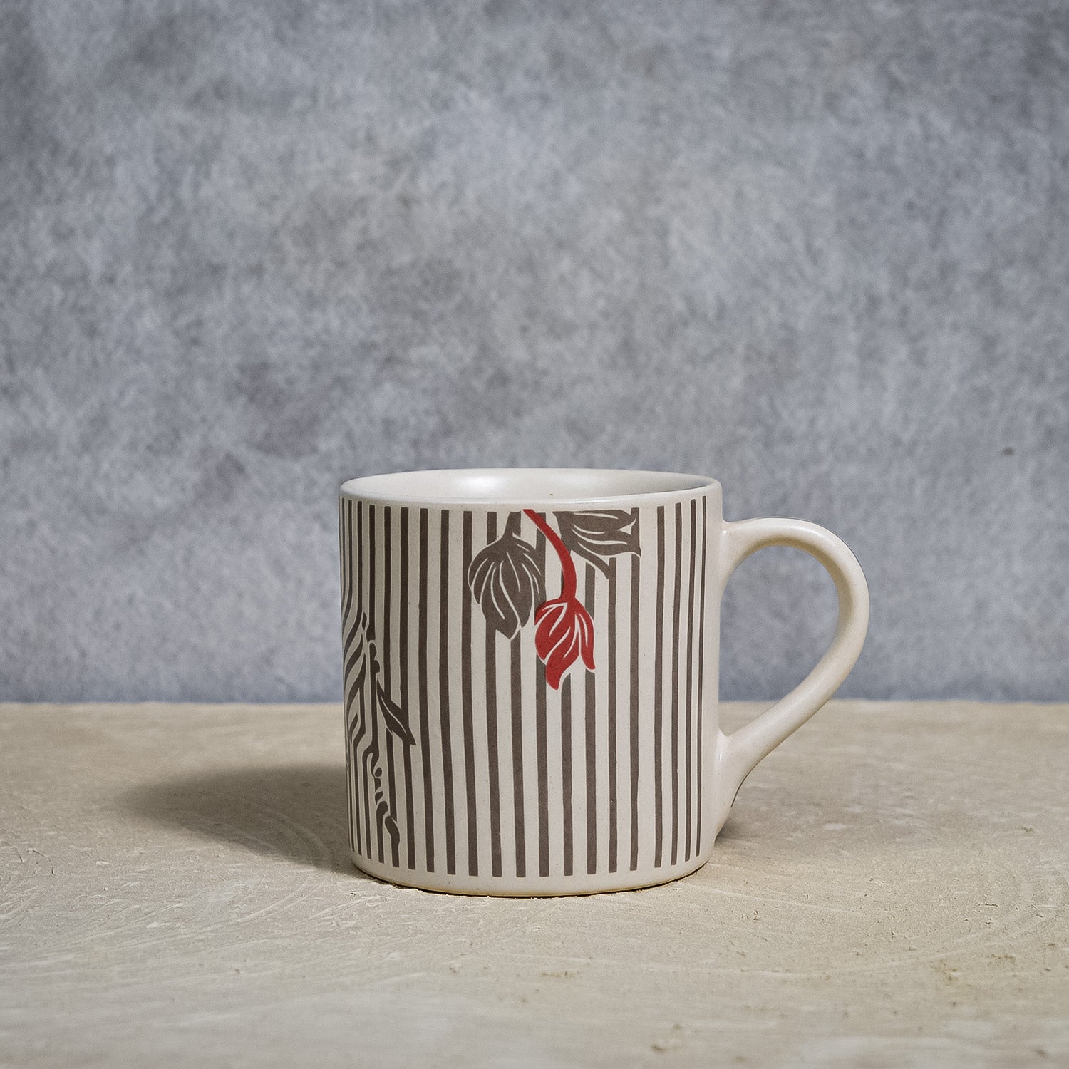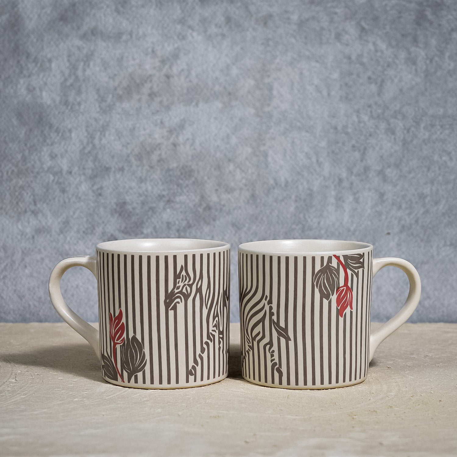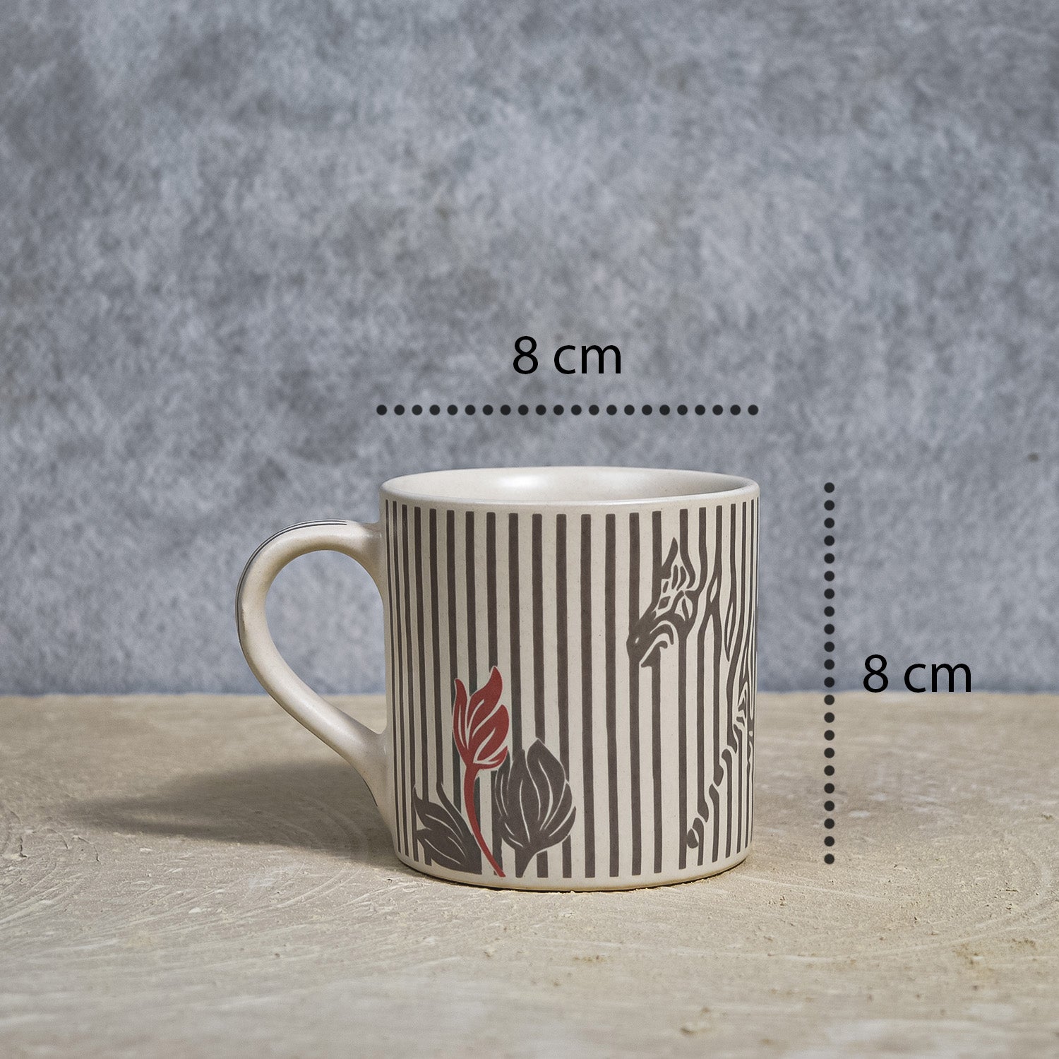 This handmade ceramic mug is adorned with a striking zebra print emerging from grey vertical lines. Adding a delightful contrast, a vibrant pink flower blooms amidst the monochromatic design. This unique combination of patterns and colors makes this mug a standout piece, perfect for adding flair to your coffee or tea rituals.